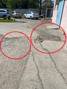 Tramo dañado del acceso peatonal al SAR La Estrella, donde se observan hoyos en el pavimento y falta de techado.